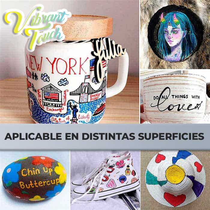 Los marcadores VIbrant Touch son la solución perfecta para quienes buscan crear arte en múltiples superficies. Desde papel y vidrio hasta madera, metal y cerámica, estos marcadores permiten trabajar en prácticamente cualquier material, sin preocuparte por manchas o pérdida de color. ofreciéndote resultados profesionales en cada proyecto.