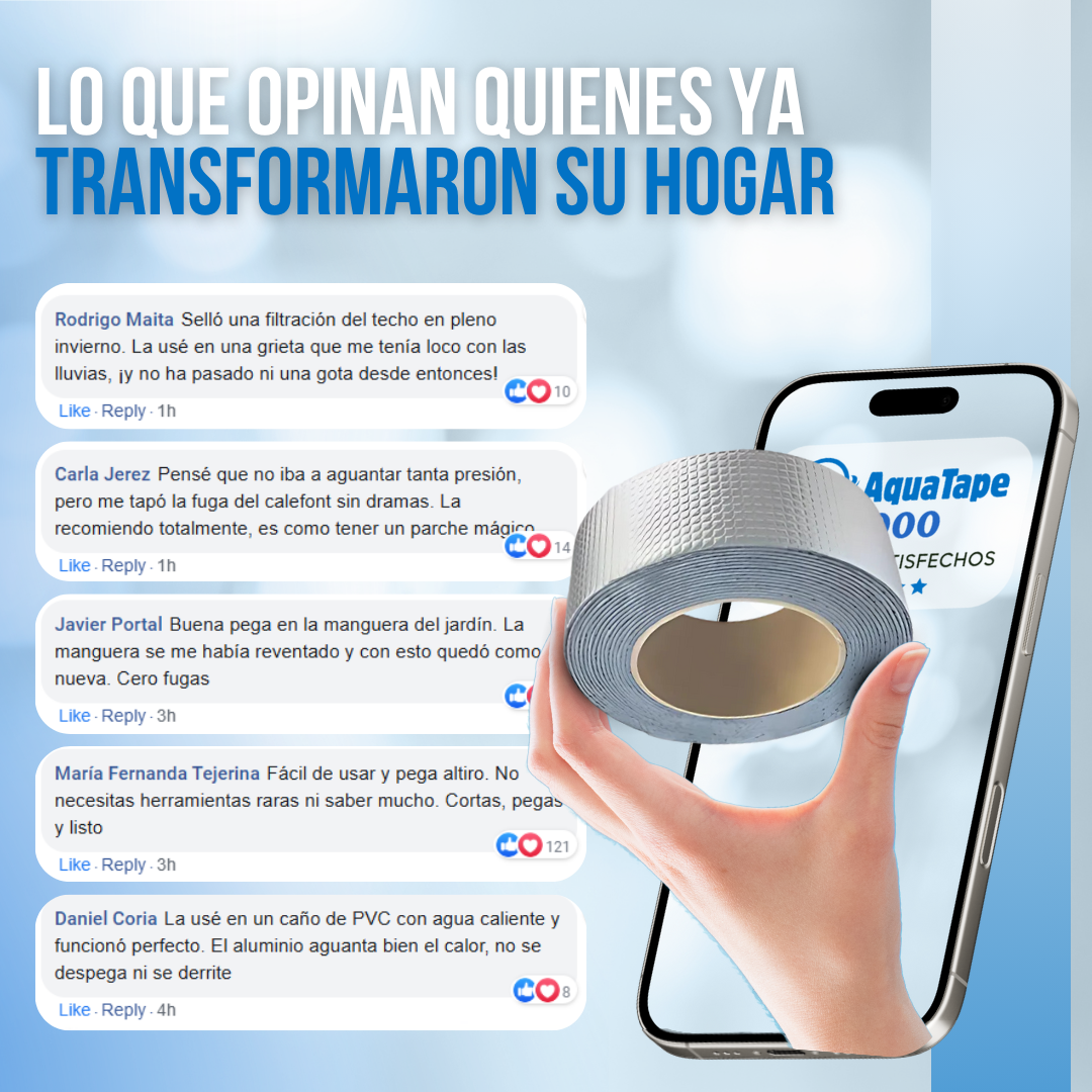 Olvídate de las soluciones temporales que no aguantan. AquaTape™ está hecha para durar. Con su potente adhesión, incluso en condiciones difíciles como la humedad y el calor, te garantiza que la reparación será efectiva y duradera. Ideal para quienes buscan soluciones prácticas, rápidas y confiables sin la necesidad de costosos servicios profesionales.