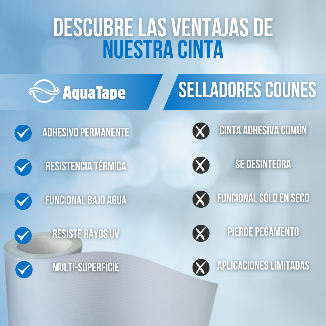 A diferencia de otras cintas comunes, AquaTape™ está construida con materiales diseñados para resistir altas temperaturas y condiciones húmedas. Con su excelente capacidad de adhesión y durabilidad, ofrece resultados que perduran, ahorrándote tiempo y dinero en reparaciones costosas. Además, su versatilidad hace que se adapte a cualquier proyecto de mantenimiento, tanto en interiores como exteriores.