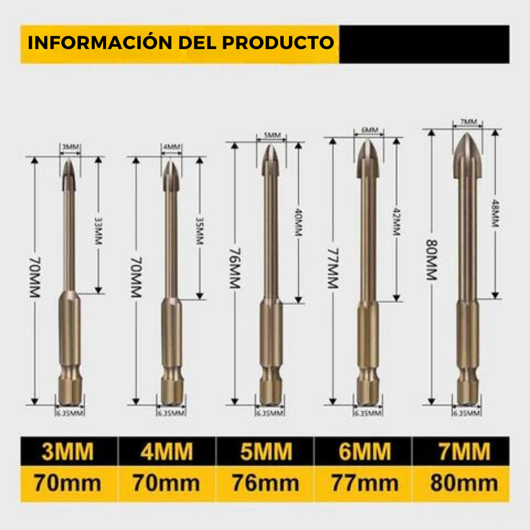 Gracias a su su superficie suave y lisia, y a su diseño de forma hexagonal, estas brocas permiten que las perforaciones sean mucho más fuertes y estables durante su uso. además. su punta de carburo afilada en forma de cruz te proporciona una mayor durabilidad al desgaste logrando realizar perforaciones mucho más rápidas.