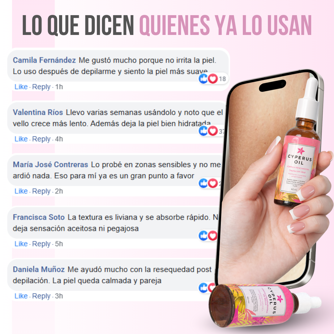 Quienes han incorporado Cyperus Oil™ a su rutina destacan su textura liviana, rápida absorción y sensación de piel suave desde las primeras aplicaciones. Muchos valoran especialmente que no genera ardor ni irritación, incluso en zonas delicadas. Usuarios frecuentes señalan que, con el tiempo, el vello crece más lento y la piel luce más uniforme. Por su efectividad progresiva y su enfoque natural, Cyperus Oil™ se ha convertido en un favorito para quienes buscan una depilación consciente y respetuosa con la piel.