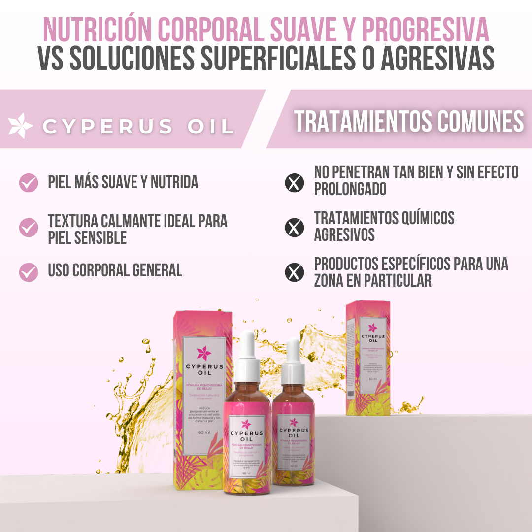 Cyperus Oil™ utiliza el poder del Cyperus Rotundus, conocido como un inhibidor natural del crecimiento del vello, combinado con una cuidadosa selección de aceites vegetales de alta calidad. Esta fórmula actúa suavemente sobre la piel, ayudando a ralentizar el crecimiento del vello sin agredir el tejido cutáneo. A diferencia de cremas depilatorias químicas, no quema, no reseca ni debilita la piel. Con el uso continuo, el vello comienza a crecer más lento y fino. Es una opción ideal para quienes buscan resultados progresivos y respetuosos con su piel.