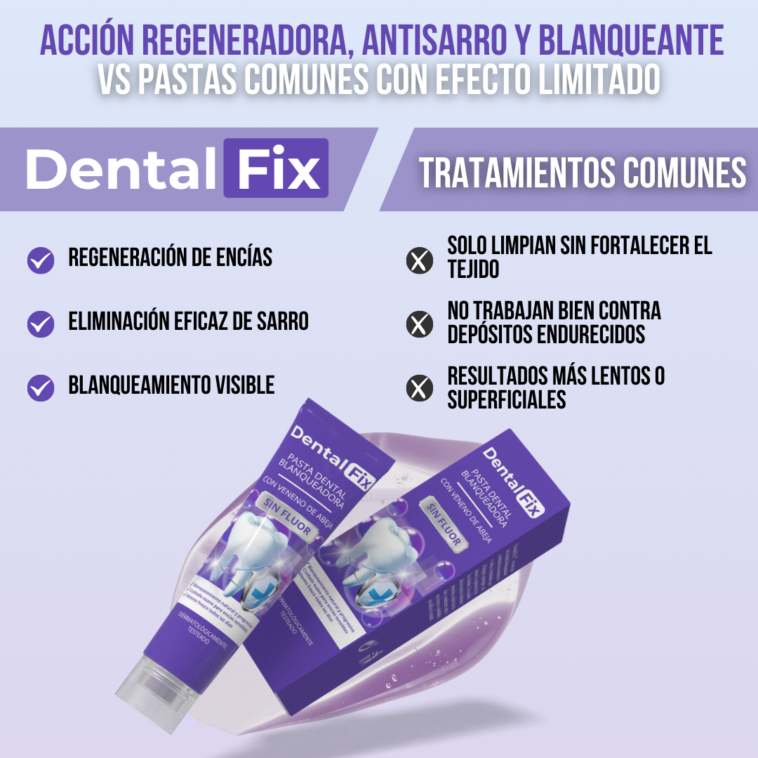 Dental Fix™ combina veneno de abeja y extractos herbales para ofrecer un blanqueamiento progresivo sin agresividad. A diferencia de pastas abrasivas, su fórmula actúa de manera respetuosa con el esmalte y las encías. Con el uso constante, ayuda a devolver el brillo natural de los dientes. Es ideal para quienes buscan una sonrisa más blanca sin tratamientos invasivos. Resultados visibles, de forma natural.
