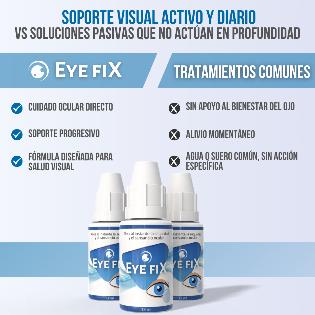 Eye Fix™ fue creado para responder a una necesidad cada vez más común: ojos cansados, secos y sobreexigidos por la vida moderna. El uso constante de pantallas, luces artificiales y ambientes cerrados genera molestias que afectan la comodidad visual diaria. Esta solución ocular ayuda a refrescar los ojos al instante, reduciendo la sensación de pesadez y sequedad. Su aplicación es rápida, discreta y efectiva, ideal para usar durante la jornada laboral o de estudio. Desde las primeras gotas se percibe una sensación de alivio y descanso. Es una excelente alternativa para quienes buscan cuidar sus ojos sin complicaciones.
