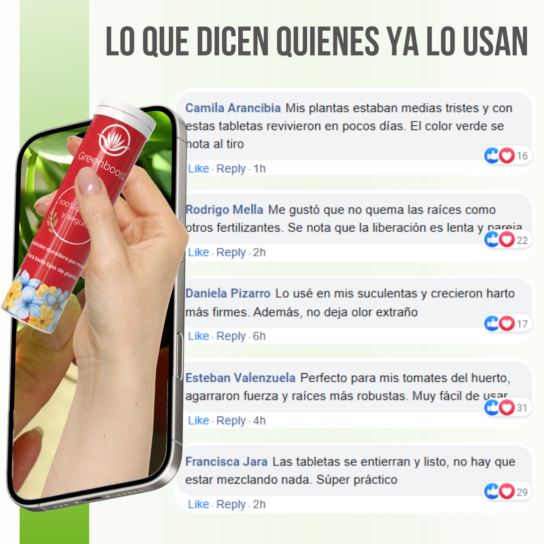Quienes utilizan Greenboost™ destacan que las plantas “reviven en pocos días”, que el color verde es más intenso y que el crecimiento se vuelve más rápido y parejo. También valoran que sea 100% orgánico, sin químicos agresivos y totalmente seguro para niños, mascotas y cultivos comestibles. Su formato en tabletas es fácil de aplicar y no genera olores ni residuos. Clientes de todo Chile lo recomiendan por su durabilidad, comodidad y resultados visibles en poco tiempo.