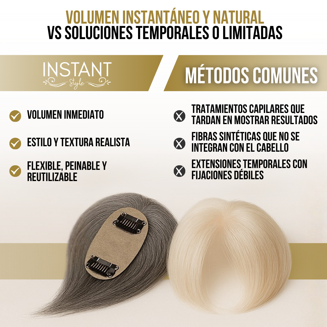 A diferencia de otros postizos o pelucas, Instant Style™ ofrece una integración más natural, mejor fijación y mayor versatilidad. Se puede peinar con calor, adaptar a distintos estilos y combinar con tu propio cabello sin que se note la transición. No requiere pegamento ni mantenimiento complejo, lo que lo hace más práctico y seguro. Además, su diseño está pensado específicamente para cubrir canas, entradas y zonas afinadas, algo que muchas alternativas no logran bien. Es una solución moderna, discreta y funcional, pensada para la vida real.