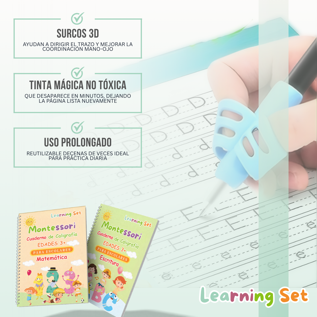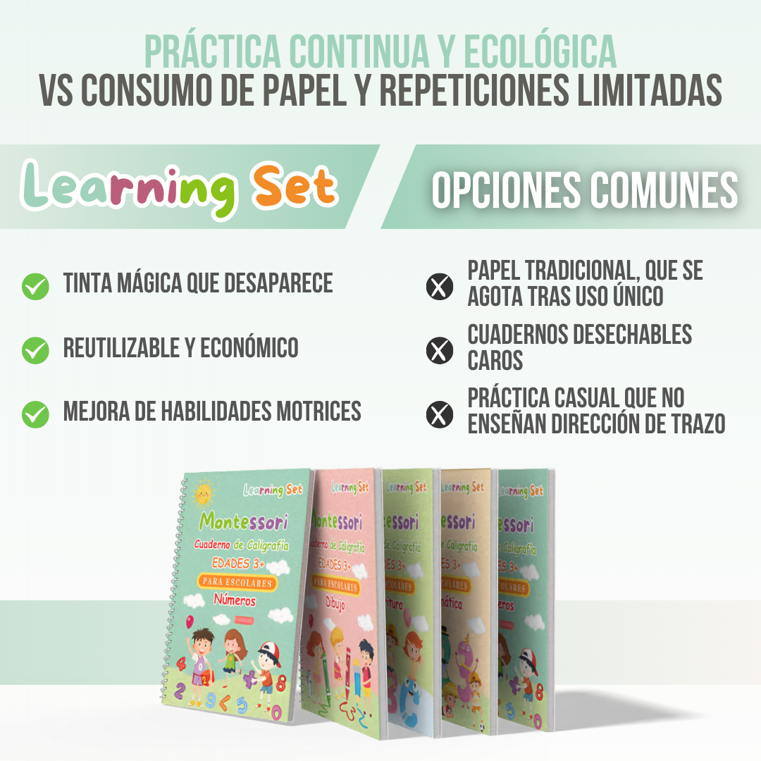 Learning Set™ destaca frente a otros cuadernos educativos por su enfoque integral y reutilizable. No es solo un cuaderno, es un sistema completo de aprendizaje Montessori. Combina escritura, números, matemáticas y dibujo en un solo kit.
