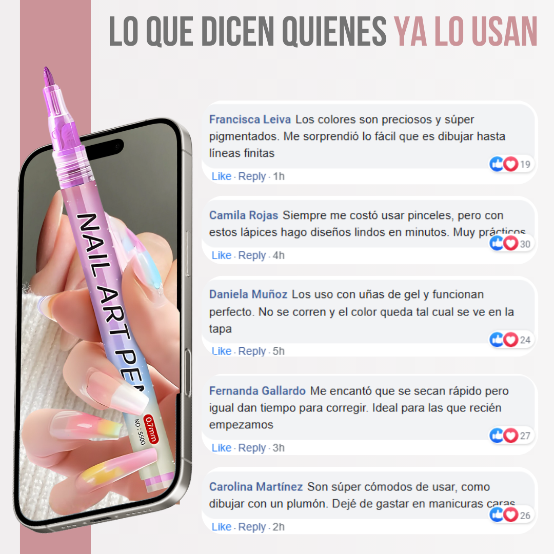 Las usuarias de Nail Markers™ destacan lo fácil que es hacer nail art sin experiencia previa y lo práctico que resulta para reuniones entre amigas, cumpleaños o para quienes trabajan desde casa. Muchas mencionan que los colores son intensos, no se secan rápido y permiten un acabado realmente profesional, incluso en diseños complejos. También valoran lo portátil y ligero que es el set, ideal para llevar en la cartera y retocar cuando quieran. Sin duda, un producto que sorprende y se vuelve imprescindible para cualquier amante del cuidado de uñas.
