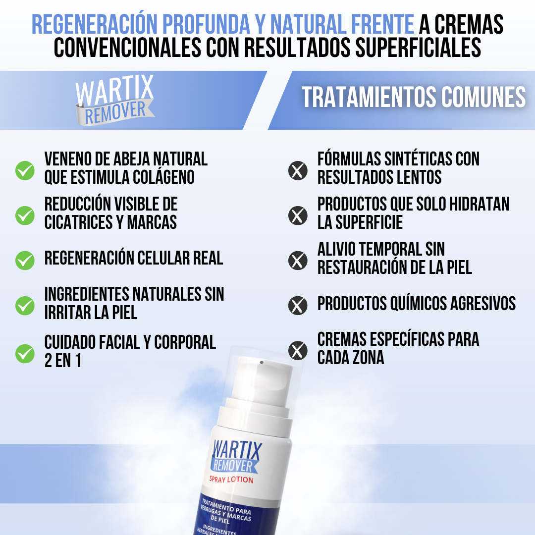 WARTIX REMOVER™ trabaja desde la base del problema gracias a su fórmula de absorción profunda, que penetra en el núcleo de la verruga o lunar para desintegrarla desde la raíz. Al eliminar el tejido afectado de forma gradual, evita el dolor y la irritación que provocan los tratamientos químicos. Su acción es precisa, efectiva y segura, promoviendo una piel visiblemente más limpia y libre de imperfecciones.
